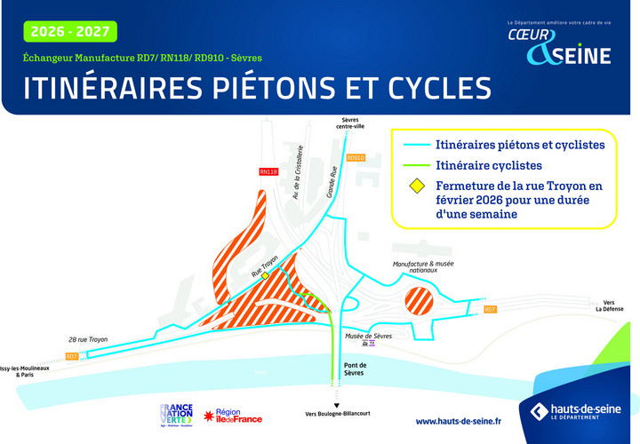 L’échangeur autoroutier de la Manufacture de Sèvres est situé au croisement de la RN 118, de la RD 7 et de la RD 910. Cet axe emprunté par plus de 280 000 véhicules par jour, manque aujourd’hui de lisibilité. Les cheminements piétons sont inaccessibles aux personnes à mobilité réduite et les pistes cyclables inexistantes.